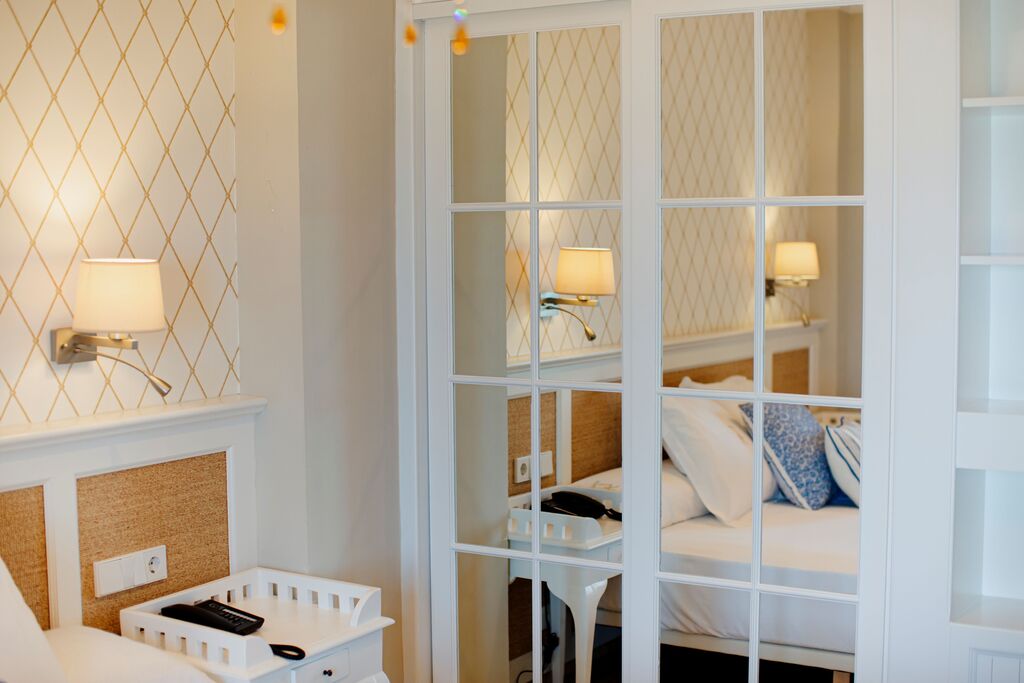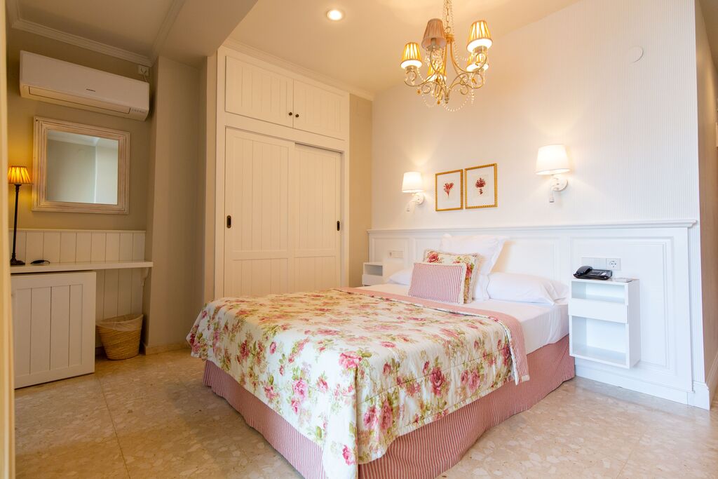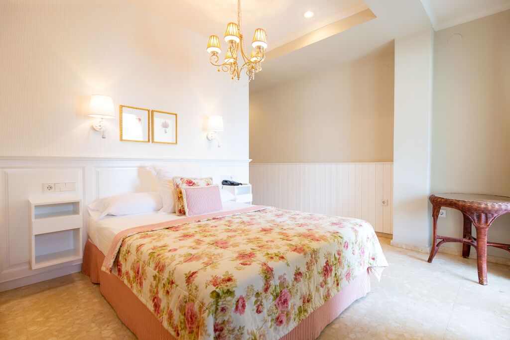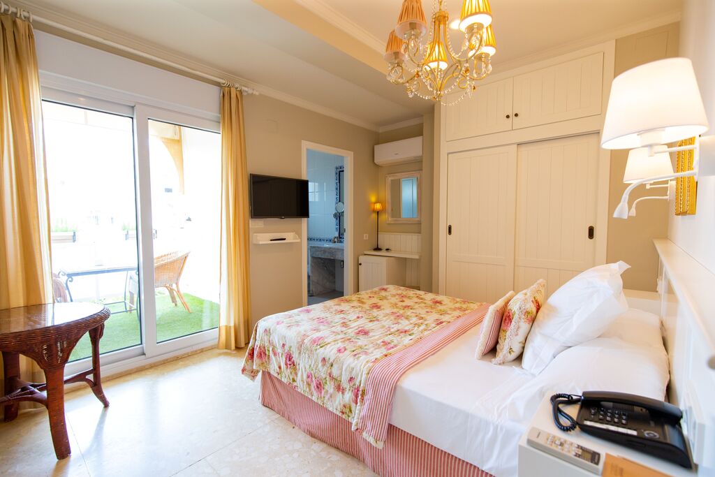 Cozy 18 m² room with a classic and elegant design, facing south. It has two single beds or a double bed, a private bathroom with a bathtub, and a 5 m² furnished terrace. Amenities: air conditioning, TV, minibar, telephone, coffee maker, toiletries, and towels. Crib available upon request and subject to availability.