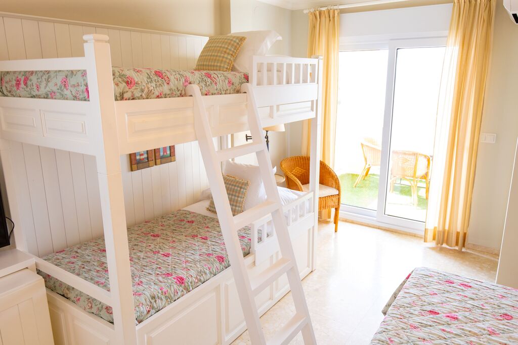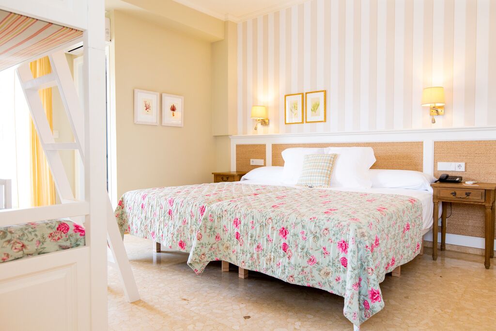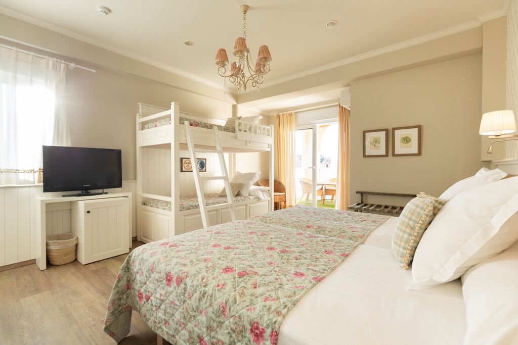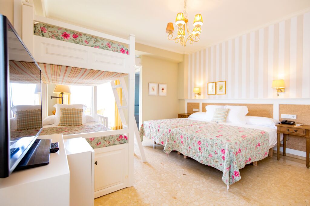 22 m² family room with carefully designed interior and functional furniture, ideal for families of up to 4 people. It has two single beds, bunk beds, a private bathroom with bathtub, and a 5 m² terrace. Amenities: air conditioning, TV, minibar, telephone, coffee maker, toiletries, and towels. Crib available upon request and subject to availability.