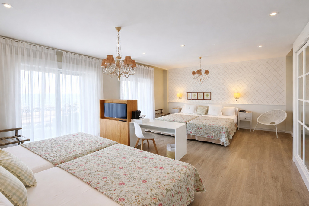 Spacious 30 m² family room with exclusive interior design and views of the Mediterranean Sea. Designed for family stays, it can accommodate up to 4 people, with two single beds and a double bed, 2 private bathrooms with shower, and a 10 m² terrace. Amenities: air conditioning, TV, minibar, telephone, coffee maker, toiletries, and towels. Crib available upon request and subject to availability.